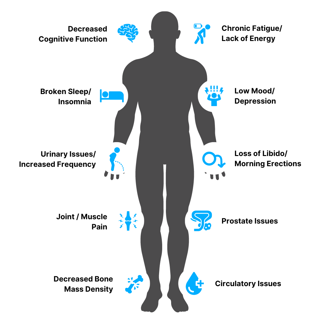 Our natural testosterone production peaks at around 19 years of age, and then declines at approximately 1% - 2% every 10 years.